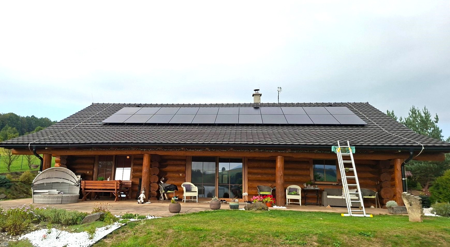 Na sedlovú strechu s škridlovou krytinou, orientovanú na juh a so sklonom 36°, sme nainštalovali solárne panely v optimálnom rozmiestnení. Vďaka ideálnej orientácii panelov je zabezpečená vysoká účinnosť výroby elektriny počas celého roka.