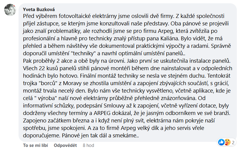 Před výběrem fotovoltaické elektrárny jsme oslovili dvě firmy. Z každé společnosti přijel zástupce, se kterým jsme konzultovali naše představy. Oba pánové se projevili jako znalí problematiky, ale rozhodli jsme se pro firmu Arpeg, která zvítězila po profesionální a hlavně pro technicky znalý přístup pana Kaliána. Bylo vidět, že má přehled a během návštěvy vše dokumentoval praktickými výpočty a radami. Správně doporučil umístění "techniky" a navrhl optimální umístění panelů.. Pak proběhly 2 akce a obě byly na úrovni. Jako první se uskutečnila instalace panelů. Všech 22 kusů panelů stihli pánové montéři během dne nainstalovat a v odpoledních hodinách bylo hotovo. Finální montáž techniky se nesla ve stejném duchu. Tentokrát trojka "borců" z Moravy se zhostila umístění a zapojení zbývajících součástí, s grácií, montáž trvala necelý den. Bylo nám vše technicky vysvětleno, včetně aplikace, kde je celá " výroba" naší nové elektrárny průběžně přehledně znázorňována. Od informativní schůzky, podepsání Smlouvy až k zapojení, včetně vyřízení dotace, byly dodrženy všechny termíny a ARPEG dokázal, že je jasným odborníkem ve své branži. Zapojeno začátkem března a i když není plný svit, elektrárna nám pokryje naší spotřebu, jsme spokojeni. A za to firmě Arpeg velký dík a jeho servis vřele doporučujeme. Pánové jen tak dál a smekáme..